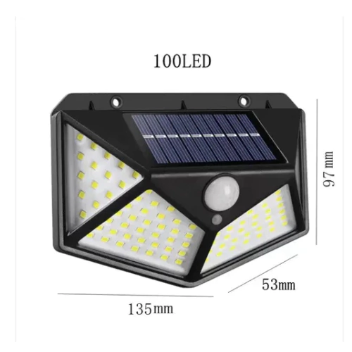 Luz solar LED de alta eficiencia con 100 focos súper brillantes, ideal para exteriores. Funciona con energía solar, sin necesidad de electricidad ni cableado, brindando hasta 600 lúmenes de iluminación automática durante la noche gracias a su sensor de movimiento de 120° con alcance de hasta 10 metros. Su batería recargable de 1800 mAh se carga en 6 horas bajo luz solar directa y garantiza un uso confiable.