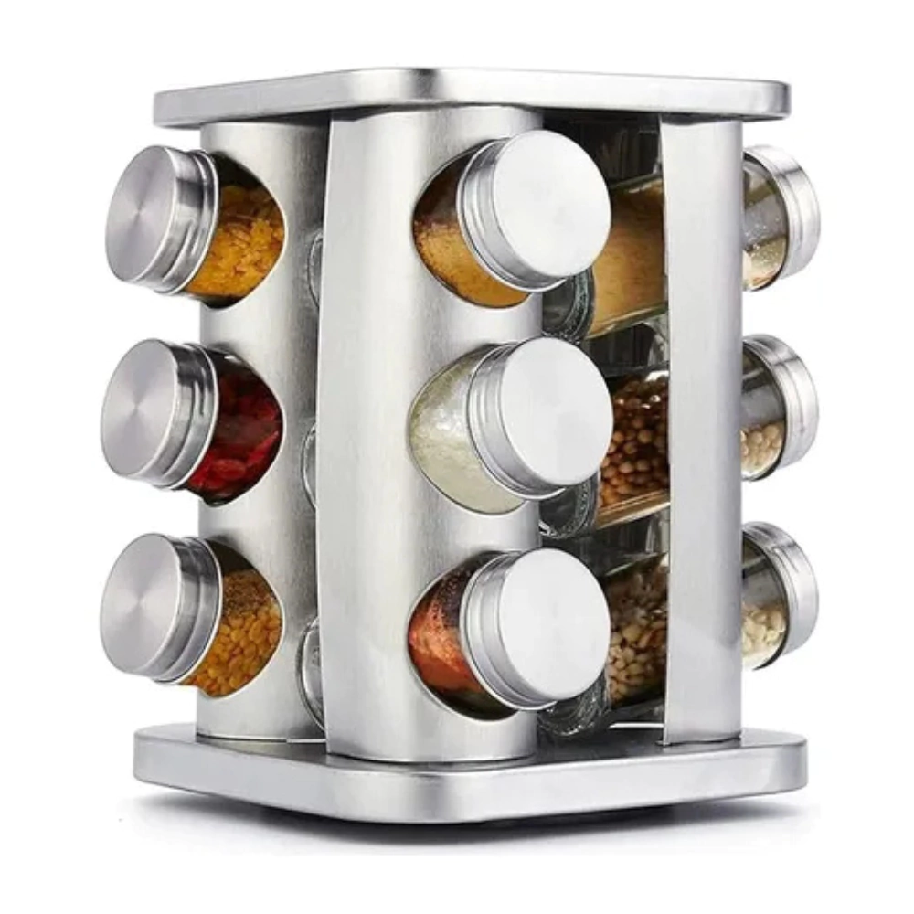 Fabricado con estructura de acero inoxidable y frascos de vidrio templado, garantiza durabilidad y estilo. Con medidas de 16 x 15 x 21 cm, es una solución funcional y estética que convierte la organización de especias en una experiencia práctica y placentera.